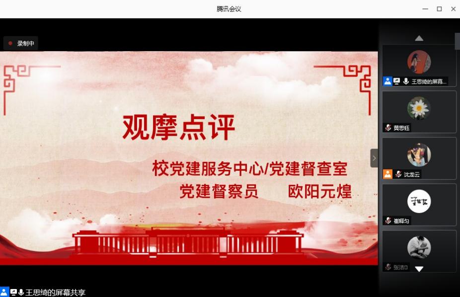 校党建服务中心/党建督查室督察员欧阳元煌老师做观摩点评,他认为支部组织生活学习内容准备详尽,支部党员同志发言内容精炼,都能够结合自身专业特点和个人情况抓住重点,紧扣主题,充分开展守初心、勇担当的交流学习,真正做到“党性锤炼守初心,砥砺奋进勇担当”。