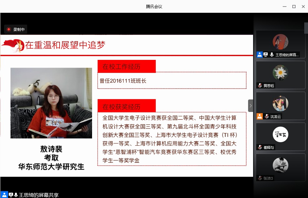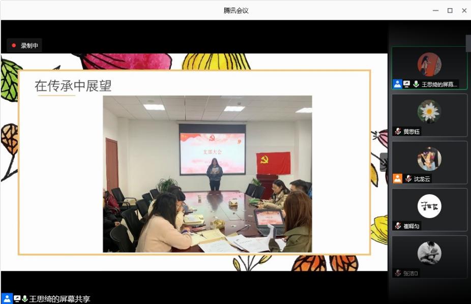 第二部分由四位党员开展“在重温与展望中追梦“主题研讨,感悟四史中学习的奋斗和担当精神,从自身的角度出发,以史为鉴,以梦为马,勇当新时代的排头兵。不管是在校的感悟还是对未来的期许,都体现了支部党员在追梦路上的奋斗足迹。同时,大三的预备党员也讲了自己的感悟与收获,在传承中展望未来。