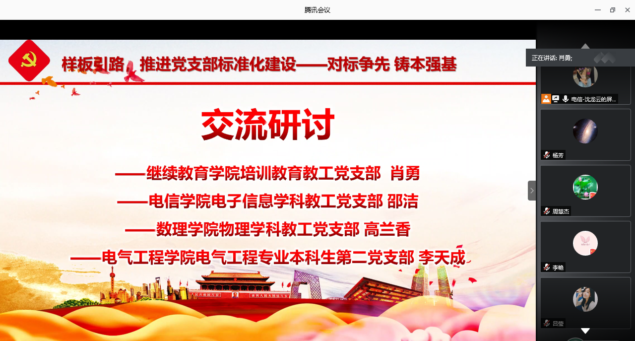 数理学院物理学科教工党支部书记高兰香、电子信息学科教工党支部书记邵洁、继续教育学院培训教育教工党支部肖勇、电气工程学院电气工程专业本科生第二党支部李天成,分别围绕党支部特色,围绕发挥党建引领作用、开展专业特色党日活动、创新育人载体、服务地方等方面开展研讨。他们提到要将支部建设成为有温度的集体,提高质量先提高政治意识,并围绕支部特色提出将开展信息化,新媒体建设,以新的形式吸引更多的青年人加入。