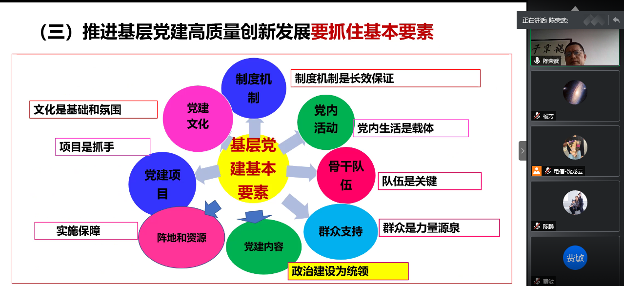 对标争先 铸本强基。讲清理论体系,将政治建设放在首位,提高党员的政治站位,筑牢信念根基。上海中医药大学陈荣武教授做《做好新时代高校基层党建工作》专题讲座,围绕当前基层党建的突破点和着力点做出了分析,引导党支部书记领会高校基层党建新形势与新任务,掌握推进高校基层党建高质量创新发展——把握新特点与拓展新思路,拓展“大党建”格局。