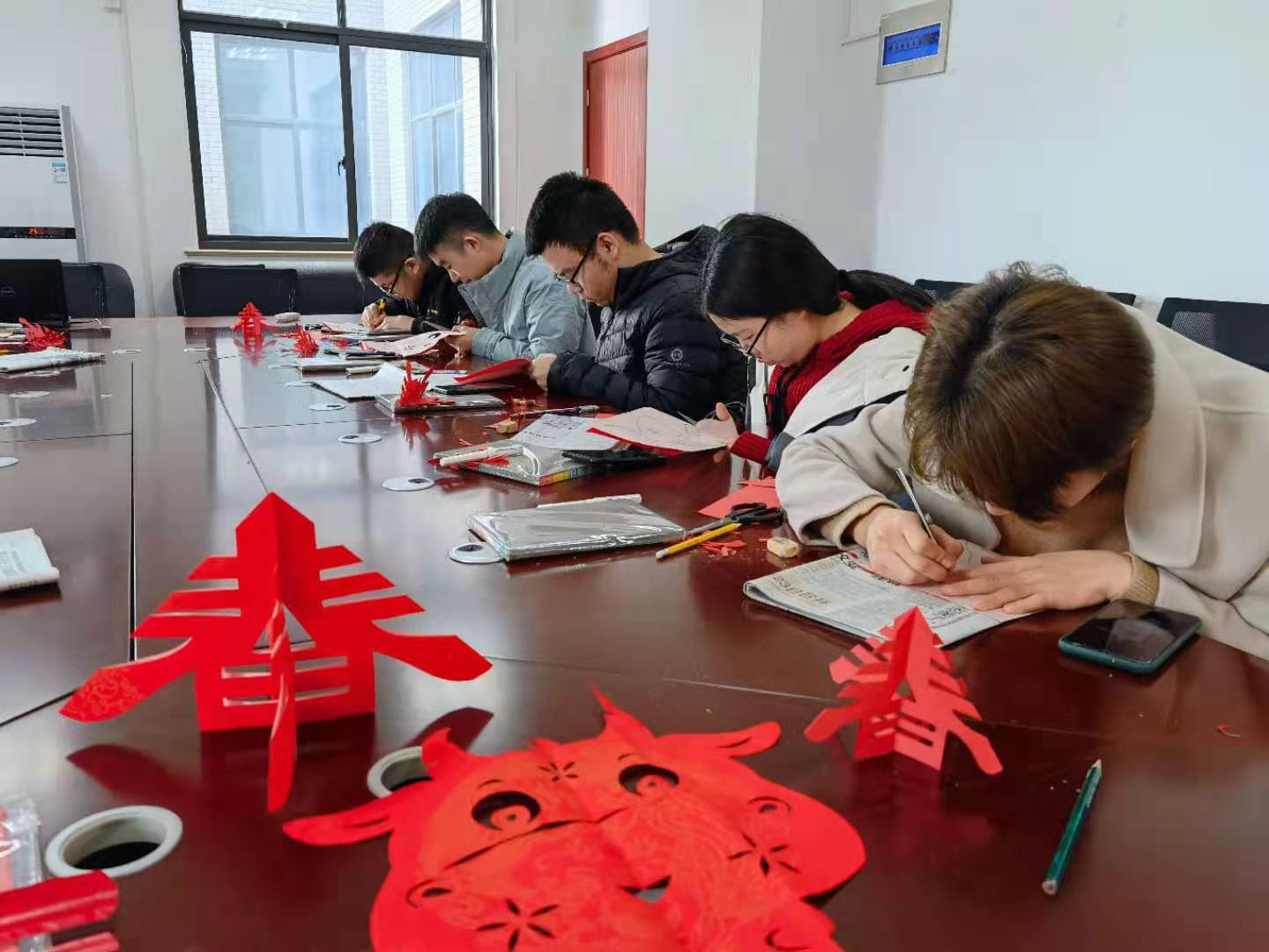 随后周冬梅为同学们带来了一堂民间传统工艺——剪纸课,一幅幅立体“春”字、卡通生肖“牛”剪纸不一会就在师生的手中跃然而出,剪纸是我国民间传统工艺美术的一种形式,作为一种佳节符号,传承着人们对于美好生活的向往,师生们一边剪、一边画、一边聊着家常,其乐融融。