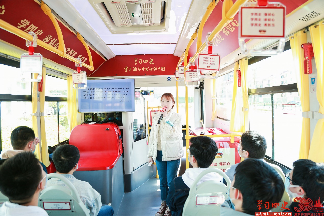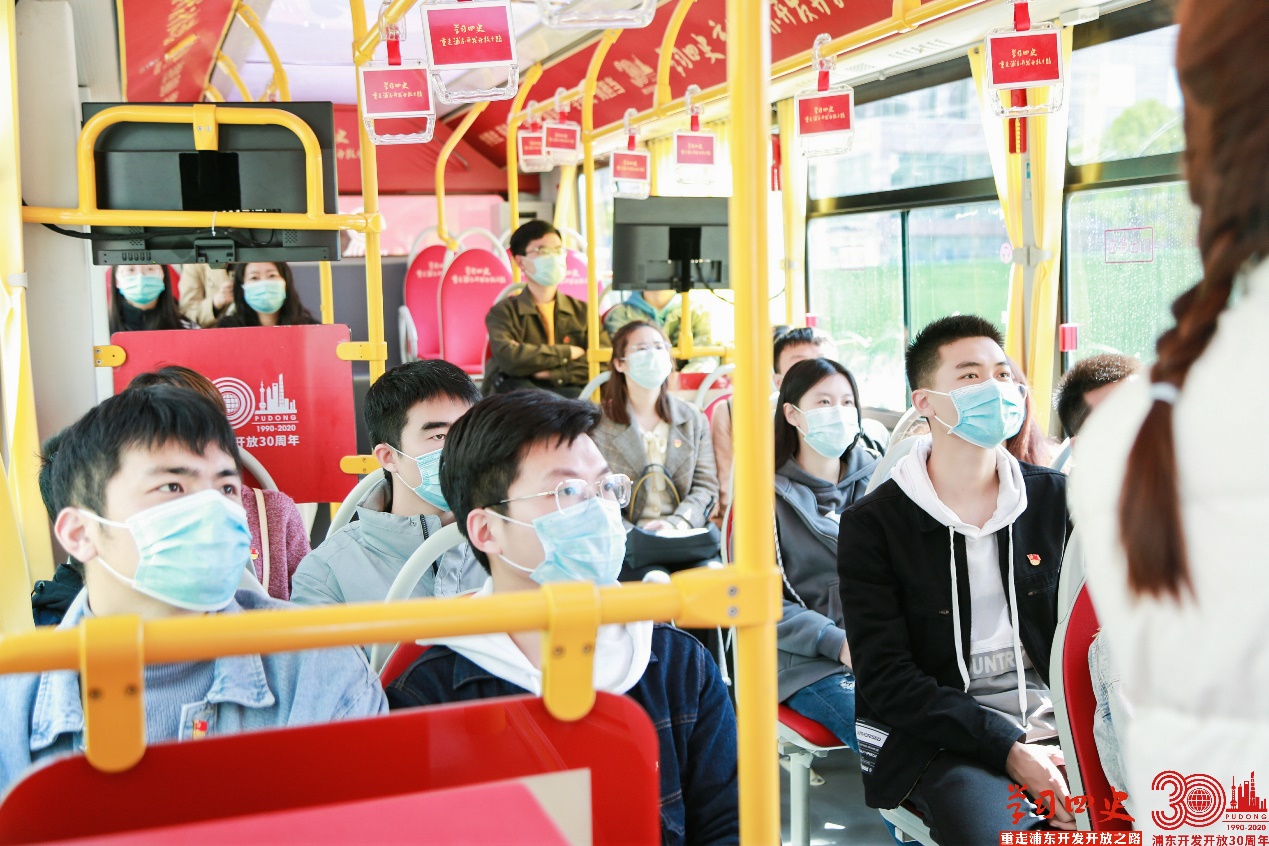在活动过程中,党员们坐在学习四史——重走浦东开发开放之路”主题巴士上,认真聆听学习讲解员的讲解。从浦东开发陈列馆出发,途径中国人民银行上海分行、陆家嘴中心绿地、国金中心、环球金融中心等高楼大厦和购物休闲热门地,直至终点站老白渡滨江。与传统的学习阵地不同,巴士通过边行车、边参观、边讲课、边互动的学习形式,塑造了沉浸式的学习体验,让参与者真实触摸到浦东发展的脉搏,从时间和空间上重温浦东开发开放之路。