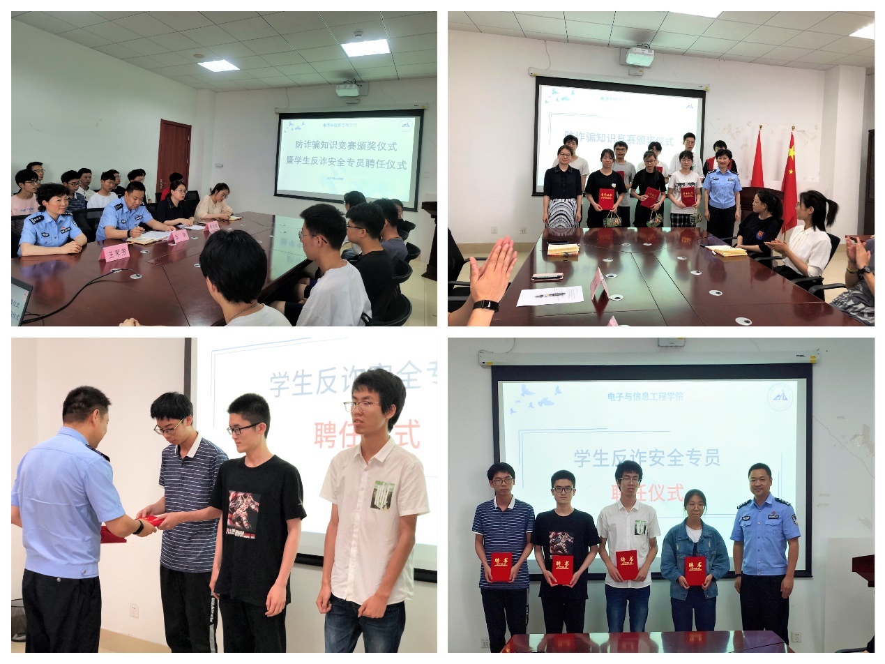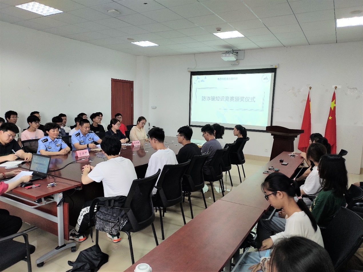 为进一步增强大学生对电信网络诈骗的了解,提升对电信网络诈骗的防范意识,学会如何预防电信网络诈骗,切实维护学生的人身和财产安全,美加墨世界杯官方网站于5月中旬在全院范围内开展了大学生防诈骗知识竞赛活动,并于6月9日在电信楼B402会议室开展了“防诈骗知识竞赛颁奖仪式暨学生反诈安全专员聘任仪式”。美加墨世界杯官方网站党委副书记周冬梅、临港高校派出所副所长张华、警官王军芳和全体辅导员以及获奖学生参会。