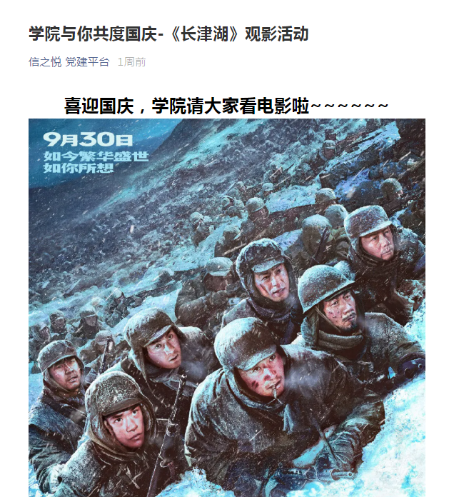 为传承红色基因、赓续红色血脉,进一步弘扬爱国主义精神,激发学生的爱国热情和奋斗精神主旋律,10月3日下午,美加墨世界杯官方网站组织本科生及研究生集体观看抗美援朝主题影片《长津湖》。观影结束后,学生们相互交流观影心得,纷纷表示要铭记历史,传承并弘扬伟大抗美援朝精神,站在“两个一百年”历史交汇点上不忘初心,牢记使命,为实现中华民族伟大复兴而不懈奋斗。