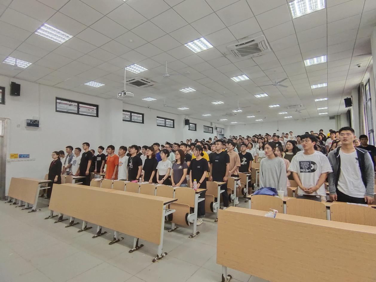 会议伊始,全体师生起立,奏唱中华人民共和国国歌。