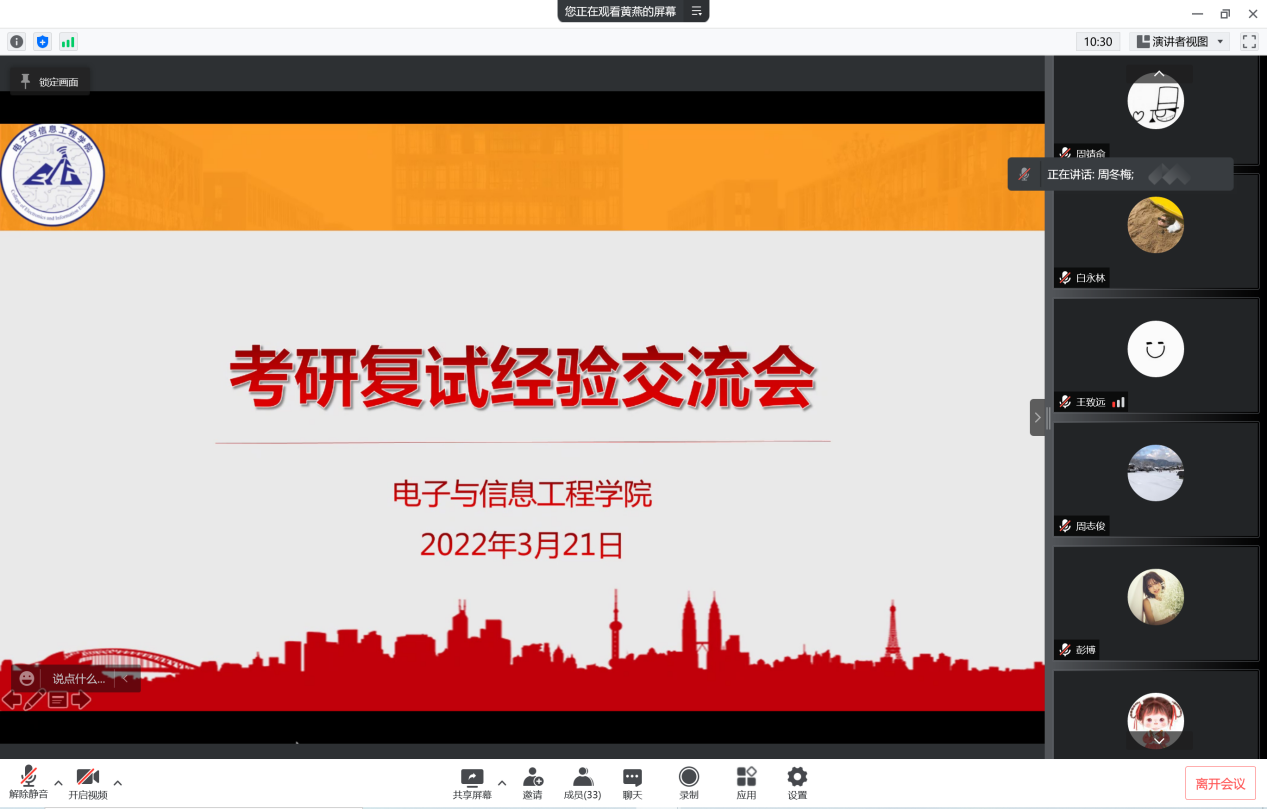 抗疫不停学,在这段特殊时期,为了使进入考研复试的同学掌握更多相关技巧,以良好的状态备战复试,美加墨世界杯官方网站于3月21日晚上7:00举办了线上“考研复试经验交流会”。美加墨世界杯官方网站党委副书记周冬梅、光电科学与信息工程专业教师薛亮、就业专项负责人黄燕、毕业班辅导员许晓天、崔释匀参会。会议还邀请了往届优秀学子进行分享。