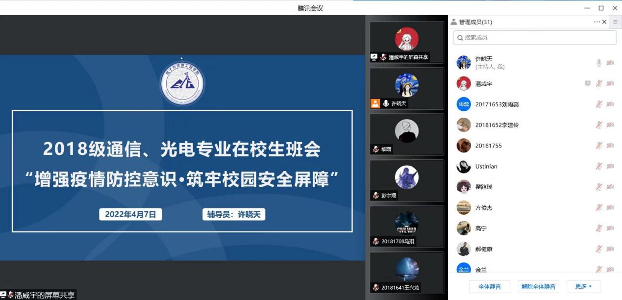疫情防控期间,美加墨世界杯官方网站辅导员发挥思想引领效应,充分利用网络与新媒体,加强正面宣传,积极传播正能量。召开《增强疫情防控意识·筑牢校园安全屏障》、《携手同心共战疫·青春聚力勇担当》等多场主题班会,引导学生正确认识当前疫情防控工作的严峻形势,普及疫情防控健康知识,引导学生不信谣、不传谣、不造谣,从“人民至上、生命至上”的角度介绍我国疫情防控原则,号召电信学子同心抗疫。倡议同学们守护自身安全,做落实防疫的“行动者”,踏实努力学习,做自我提升的“示范者”,科学应对疫情,做正能量的“传播者”,主动担当作为,做抗击疫情的“践行者”。
