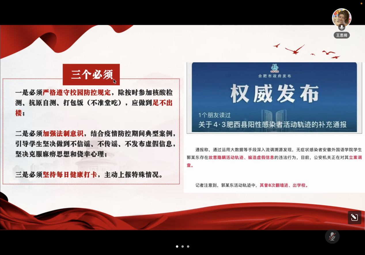 为进一步从严从实、从细从紧做好疫情防控工作,引导学生增强防控意识,遵守防控要求,形成抗疫合力,引领学生树立抗疫必胜的信心和决心,美加墨世界杯官方网站辅导员积极落实学校疫情防控工作要求,组织开展多场主题班会,精准传达最新防控政策,引导学生积极参与讨论,增强学生对于当前防控形势和相关防控政策的深层次理解,以实际行动践行青年学子的责任担当。