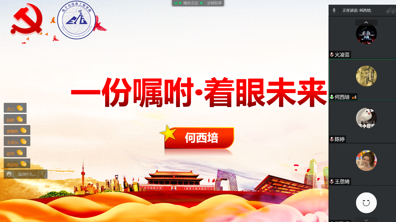 一份祝福·寄语母校。毕业生党员代表陈婷、杨志鹏、潘威宇、王致远、彭博、火凌芸等围绕“党支部工作、疫情防控、社会实践、就业经验”等方面分享了自己的感悟和体会,感恩母校的教育和培养。他们代表全体毕业生党员表示将始终牢记党员身份,保持“站在前、走在前、干在前”的先锋姿态,不负学校和老师的嘱托,努力奋斗,争创佳绩,肩负起新时代青年的使命与担当。低年级党员也通过视频寄语的形式,为学长学姐们送上深情祝福。