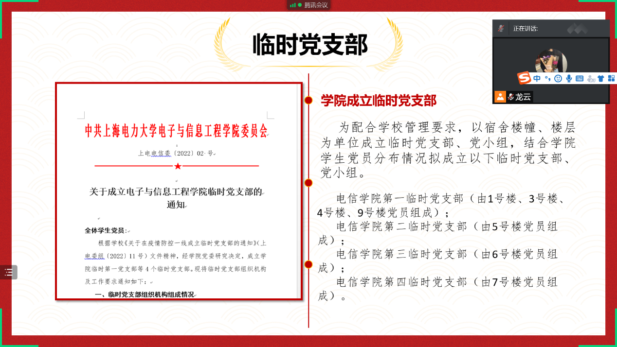 沈龙云布置了学院党员活动安排,宣布《关于成立美加墨世界杯官方网站学生临时党支部的通知》。在学院党委的领导下,学院各临时党支部将下沉到楼层和宿舍。通过亮身份、亮承诺、亮行动、亮服务、亮成效“五亮”活动,切实发挥基层党组织和党员在疫情防控中的先锋队、排头兵的作用。同时要求各支部认真开展“我为群众办实事”“勇担抗疫重任,书香溢暖人心”等活动,积极做好宣传引导,弘扬正能量。