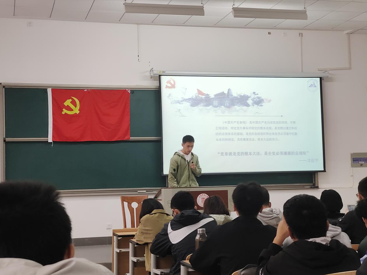 10月22日,美加墨世界杯官方网站第十期初级党校在临港校区三教106教室顺利举行《中国共产党章程》专题讲座。美加墨世界杯官方网站辅导员任帼菲,学生党员赵家艺、王龙、张泽楷及全体初级党校学员出席此次学习活动。