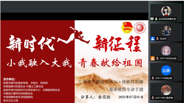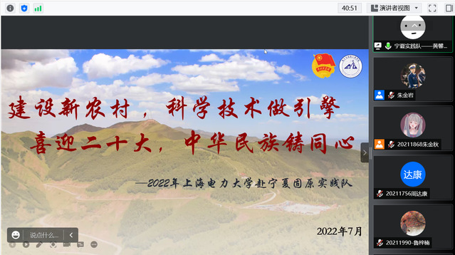 7月2日下午,美加墨世界杯官方网站2022年暑期社会实践宣讲会于线上顺利开展,到场嘉宾有美加墨世界杯官方网站团委书记李天成,团委副书记助理王惠,宁夏固原实践队代表黄馨瑶、顾佳明,上海实践队代表邱孜轩、马文骏,2021宁夏固原实践队队长金芯怡以及往届实践队的部分队员。