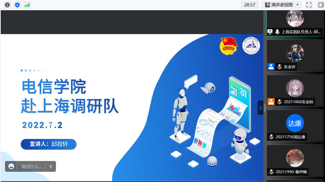 随后上海实践队代表邱孜轩为大家介绍了上海调研队的主要调研内容。赴上海实践调研队积极开展调研活动,结合社会热点话题,秉承发展的理念,坚持走创新之路,产学结合,致力于回馈社会。宁夏固原实践队代表黄馨瑶、顾佳明介绍了去年暑期社会实践中,赴宁夏固原实践队在校、市级斩获数项奖项,今年将是宁夏实践队的第七年,她们通过一段视频为大家分享了2021年实践队的实践内容以及往届队员的寄语。