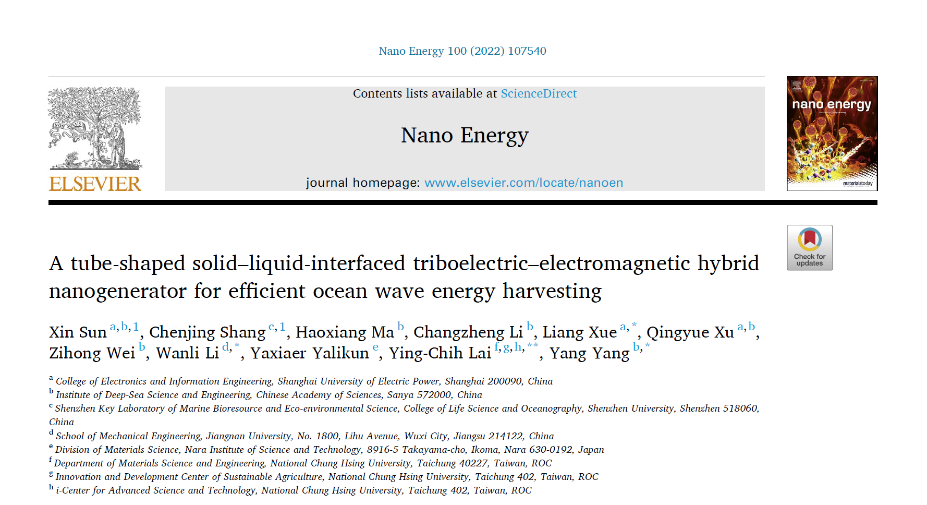 世界杯官网薛亮老师与中国科学院深海所杨阳研究员团队、台湾中兴大学赖盈至教授团队等合作的研究成果于2022年6月在国际顶级期刊《Nano energy》(中科院SCI一区,IF:19.069)在线发表,论文题目“A Tube-Shaped Solid-Liquid Interfaced Triboelectric- Electromagnetic Hybrid Nanogenerator for Efficient Ocean Wave Energy Harvesting”。世界杯官网2020级硕士生孙鑫同学是本文的第一作者,深圳大学尚琛晶是共同第一作者,第一单位为美加墨世界杯官方网站。