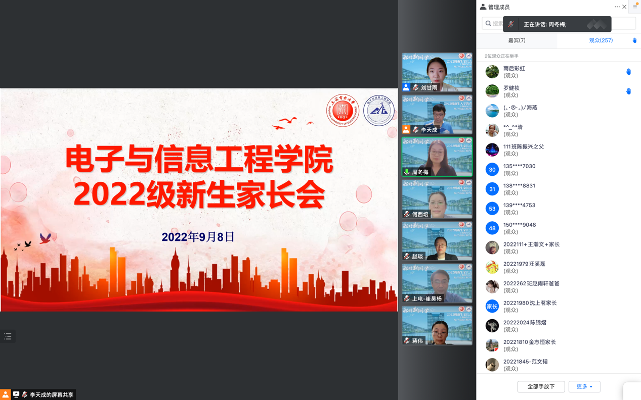 9月8日晚,美加墨世界杯官方网站召开了全体新生线上家长会,向新生家长们介绍了学校、学院、专业情况、学生学籍管理、考研升学、学生事务管理等工作,帮助新生家长们进一步了解学生进入大学之后的管理体系、学习内容和发展方向,引导新生家长主动关心学生学业规划、心理健康以及环境适应等问题,明确大学阶段家长的职责,增强家校合作,实现家校共育,助力和保障每一位学生成长成才。