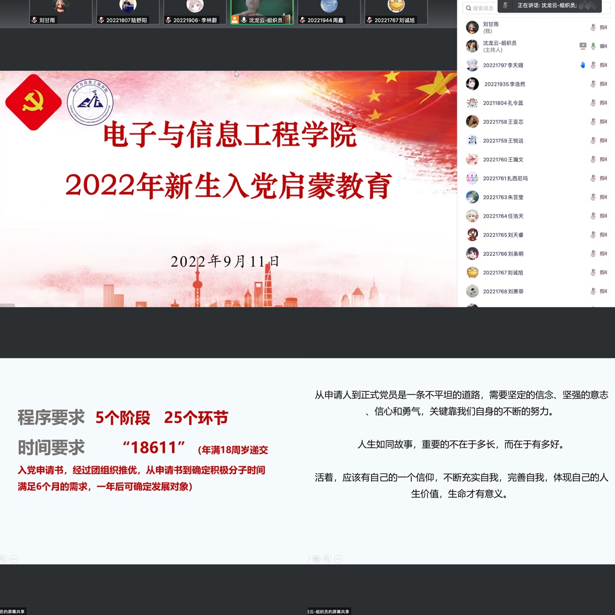 9月11日晚,学院组织员沈龙云为全体新生开展了入党启蒙教育。从中国共产党的创业史出发,通过讲述革命先辈们的感人故事,激发同学们的家国情怀,并结合党章向同学们介绍了发展党员的要求、条件、流程和入党申请书的格式要求等,引导新生积极主动向党组织靠拢,端正入党动机,先从思想上入党,再从行动上入党,主动担当作为,最终达到理想彼岸。