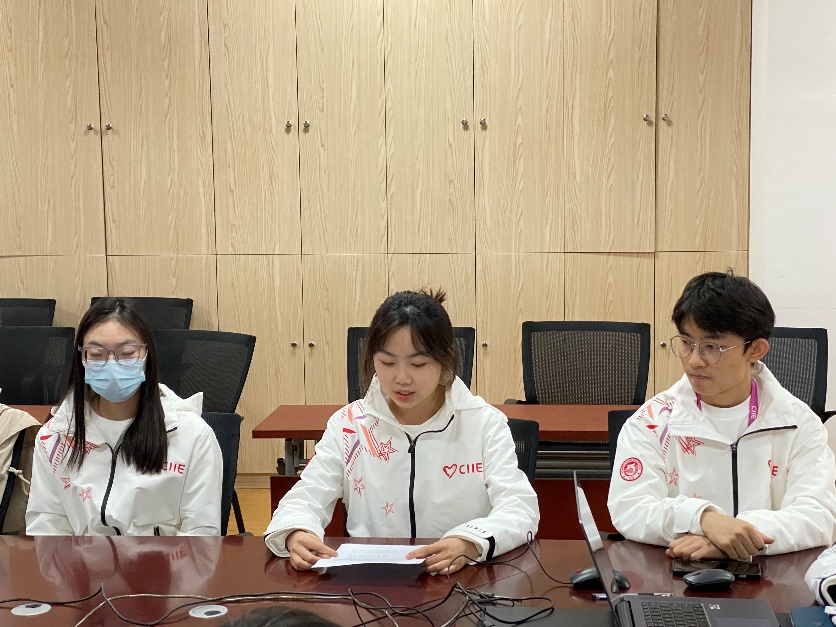 周冬梅介绍了美加墨世界杯官方网站第五届进博会志愿者的总体情况。美加墨世界杯官方网站积极响应校团委的部署,九月底开展进博会志愿者招募工作,共计67名同学积极报名参加,经过层层筛选,最终选拔出10名进博会志愿者。其中,研究生1人,本科生9人。10人中,有2人参加过进博会志愿服务;7人参加过社会实践,占总人数的90%。本届进博会电信“小叶子”的工作主要分布在展务、进博会信息系统综合岗、入场证件服务点三大岗位。