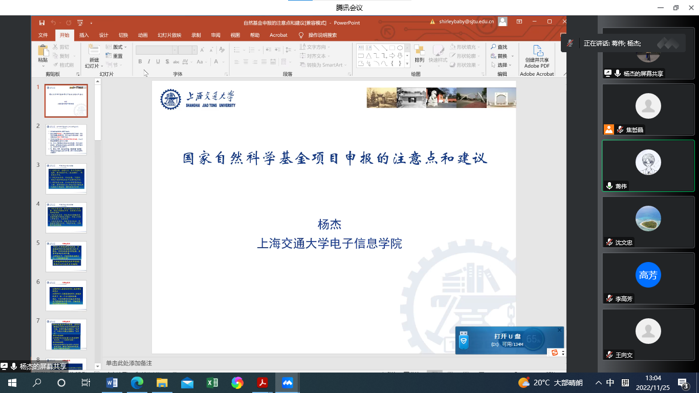 2022年11月25日13:00,世界杯官网主办的“2023年国家自然科学基金申报系列活动”第2期成功举办。本次活动邀请了上海交通大学图像处理与模式识别研究所所长、“模式识别与智能系统”国家重点学科负责人、博士生导师杨杰教授作国家自然科学基金申报讲座。讲座由副院长蒋伟主持,学院近30名教师参加了会议。