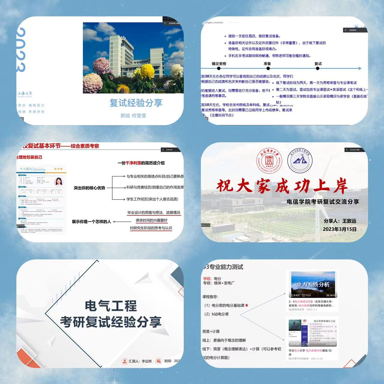 会上,大家结合自身经验作分享。王致远从英文自我介绍、专业知识问答、综合素质考察三个方面对复试流程进行了详细的介绍,强调要根据自己的实际情况,实事求是回答问题。矫玺本从选导师、预面试、专业课等多个方面为报考电子科技大学的考研学子们解答疑惑,他强调在准备复试前需要了解对应专业的导师信息,同时要多模拟、多练习,以充足的准备去应对复试。李企洲重点分享了世界杯官网电气学院复试时的经验,强调在英语能力测试中的问答环节时要注意运用专业词汇,回答要突出逻辑性,切忌紧张慌乱。周靖俞结合上海理工大学的复试进行了分享,提醒同学们调整好心态,面试过程中要尽量展示自身的优点与特长。张相鹏分享了本校跨考调剂经历,指出在调剂时要慎重选择,保持良好的心态,积极应对挑战。郭旭和何莹莹围绕上海大学的复试科目、复试流程等方面做了详细的介绍,建议在复试前准备一份亮点突出的简历,并对内容要了然于胸,为面试做充足的准备。