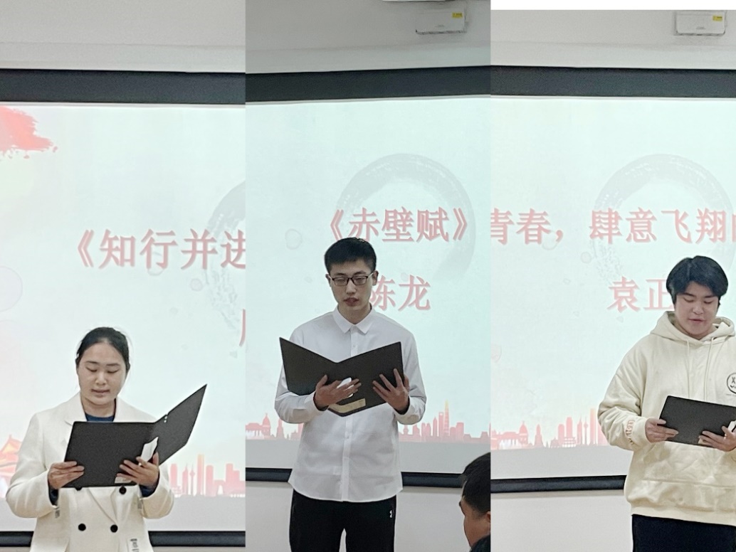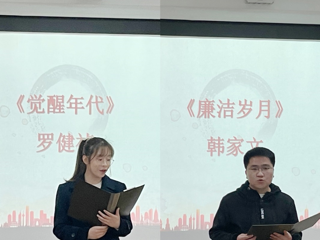 随后,青年理论宣讲团的5位同学朗诵分享了《赤壁赋》《觉醒年代》《廉洁岁月》等经典篇目和原著内容,声情并茂的演绎让在场的老师同学们深深感受到中华文化的无穷魅力,沉浸其中。