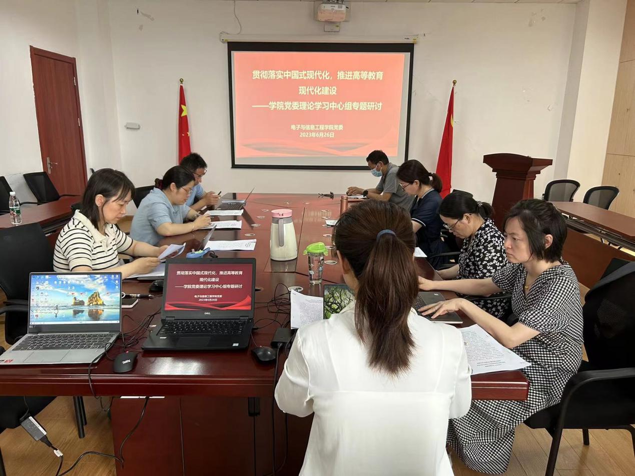 在专题研讨中,中心组成员纷纷表示,高等教育现代化是实现中国式现代化的重要路径和战略支撑,这也是新时代新征程赋予高校教师的历史使命和时代课题,在工作中,要坚持不懈用习近平新时代中国特色社会主义思想铸魂育人,着力加强社会主义核心价值观教育,引导学生树立坚定的理想信念,进一步加强电子信息类专业科学教育、信息工程教育,加强创新人才培养,落实立德树人根本任务,以高等教育现代化助推中国式现代化。