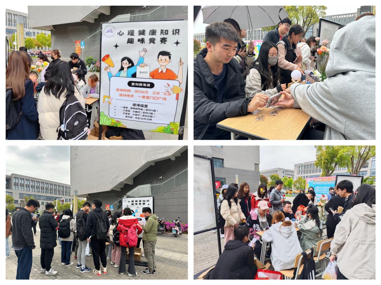 心理健康知识宣传,呼吁关注自身成长。通过线上线下相结合的方式,共计开展了3场心理健康知识宣传活动。3月31日下午,美加墨世界杯官方网站特邀心理健康教育中心蔡雅琦博士为2022级全体新生作“人际关系的自我及相互依赖”心理健康教育专题讲座,使大一新生认识到了人际交往的重要性,学会在自我调节中与他人融洽相处,在未来的学习生活中保持积极向上、阳光乐观的心态,帮助新生更好地适应大学生活。4月25日,在临港校区一食堂门口小广场,举办心理健康知识趣味竞赛活动,以有奖答题的方式,鼓励同学们积极关注自身心理健康,使同学们在放松愉悦的状态中学习到了心理健康知识。此外,以学院微信公众平台为依托,分别从专注力提升、减少心理内耗、告别负面情绪、拯救失落心理四个方面,制作心理健康系列知识推送,引导同学们了解在面临压力和困难时自我调适的方法,以积极心态面对生活。
