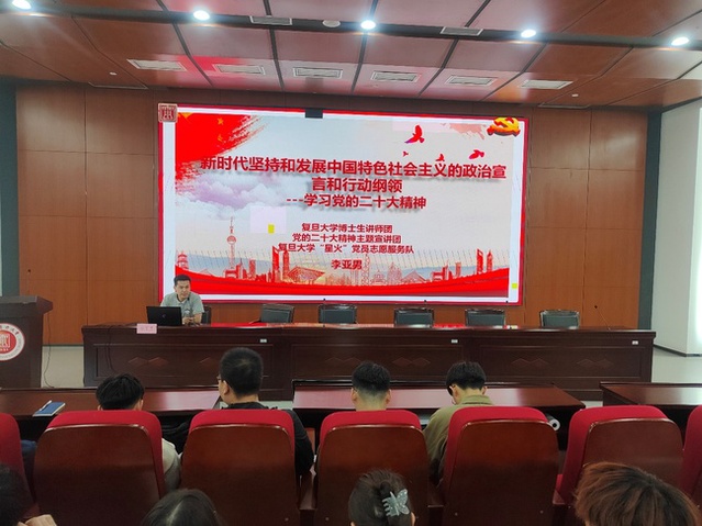 复旦大学博士生讲师团讲师、“星火”党员志愿服务队队员李亚男为学员们作了题为《新时代坚持和发展中国特色社会主义的政治宣言和行动纲领》的报告。他结合在复旦大学《共产党宣言》展示馆“星火”党员志愿服务队的工作经历,从朋辈引领的视角出发,着重阐释了党的二十大报告对青年的要求,为学员们深刻理解和准确把握党的二十大精神的丰富内涵和核心要义提供了思路和指导。
