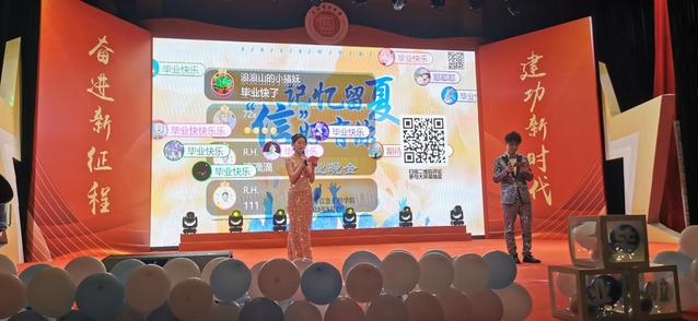 中场休息时,“从天而降”的100个气球让人惊喜万分,每个气球里都藏有一份对毕业生的殷切祝福,更有11位同学拿到了其中的惊喜气球。精心设计的幸运气球和大屏幕互动抽奖两个中场活动,将整场晚会现场推向了高潮,现场观众踊跃参与互动抽奖。