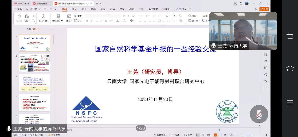 11月20日晚上19:30,美加墨世界杯官方网站邀请云南大学材料科学与工程学院王茺研究员进行题为“国家自然科学基金申报的一些经验交流”讲座。会议由薛亮副院长主持,使用腾讯会议线上进行,约60余名学院教师及研究生参加了讲座。