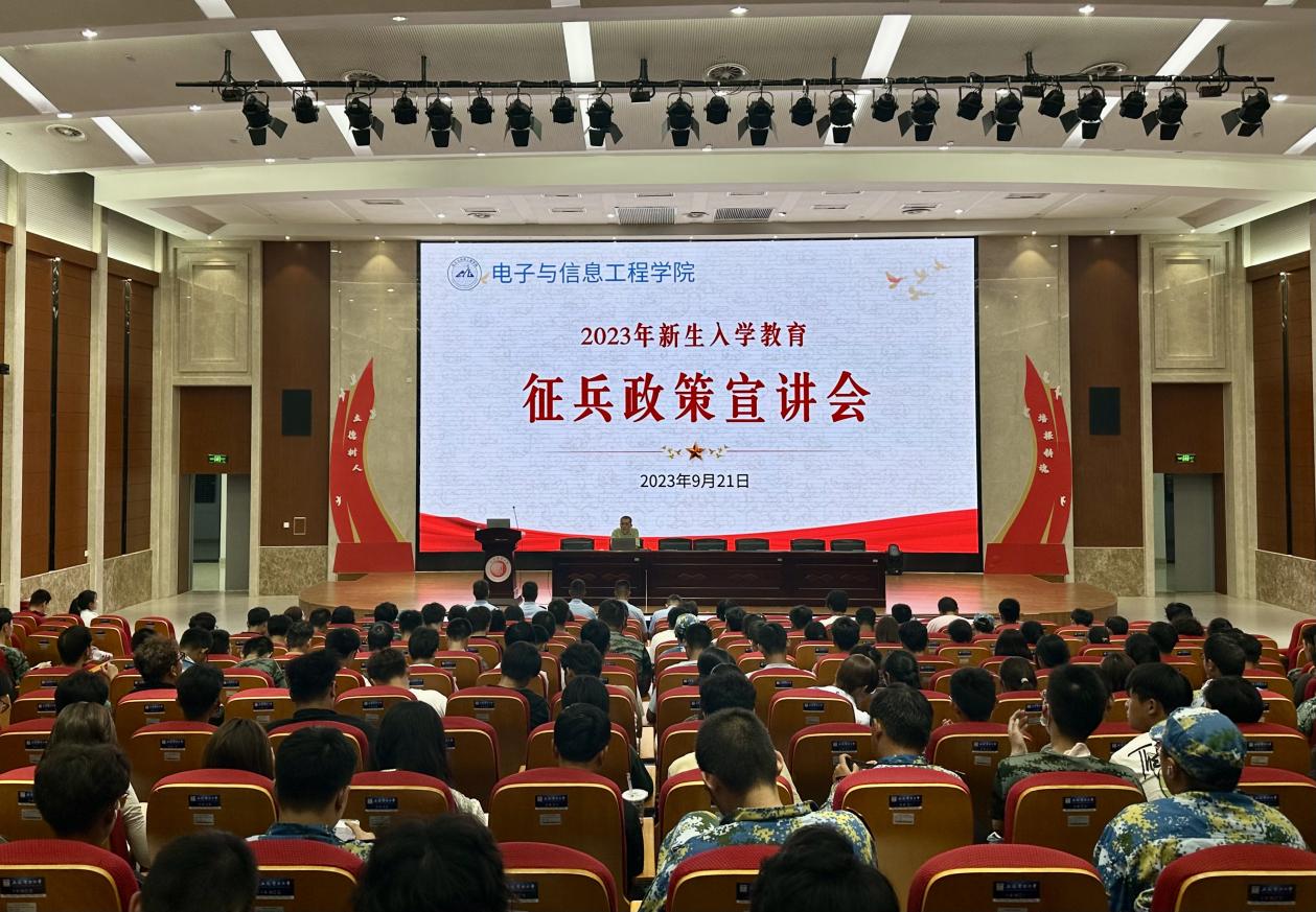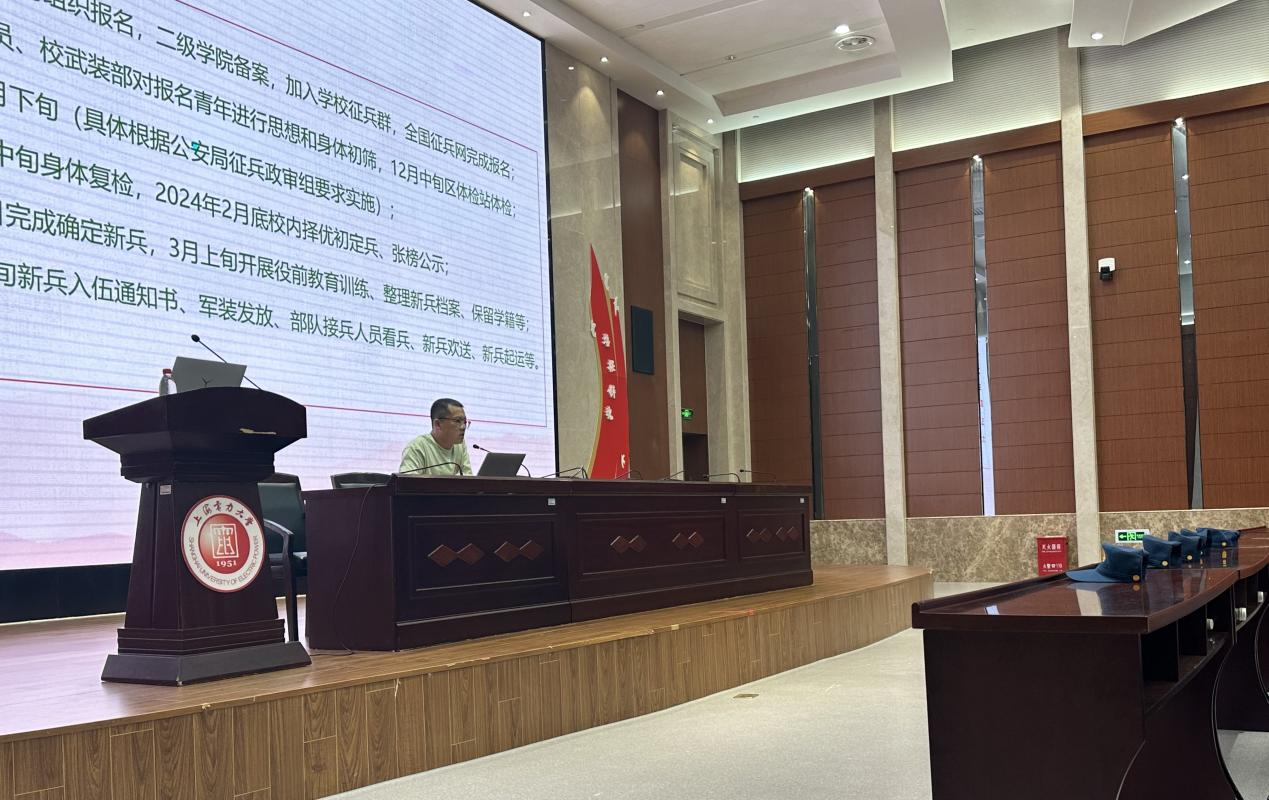 为扎实有效推进2024年征兵入伍工作,对新生做好国防教育,激发学生参加入伍热情,近日,美加墨世界杯官方网站在学术楼117报告厅组织召开2023年新生入学教育系列活动之征兵政策宣讲会。学院征兵工作负责人阮文杰、本科新生辅导员、军训教官、退伍士兵代表以及全体新生参会。