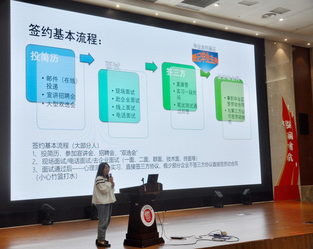 黄燕围绕毕业生关心的签约流程、毕业材料、应届生身份、求职陷阱等问题进行了详细讲解。佘茂源、顾雪珺到场分享求职经验,校友们结合自己的职场经验指出高校毕业生就业形势严峻,希望广大同学做好自身定位,抓住求职机会,精心准备面试,认真对待每一次就业应聘。他们鼓励毕业生在未来的一年里,不忘初心,明确方向,抓住机遇,勇于实践,顺利就业,为自己的大学生活划上圆满的句号。