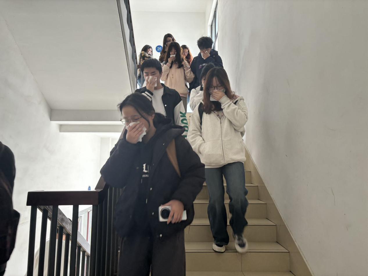 12点20分,演习总指挥何西培宣布美加墨世界杯官方网站临港校区电信楼火灾疏散逃生演练开始。烟雾弹释放,警报拉响,位于各房间的师生开始有序撤离,并在电信楼一楼外广场处集合。全部人员撤离完毕后,消防专员现场讲解灭火器使用方法,并组织师生进行了灭火演习。