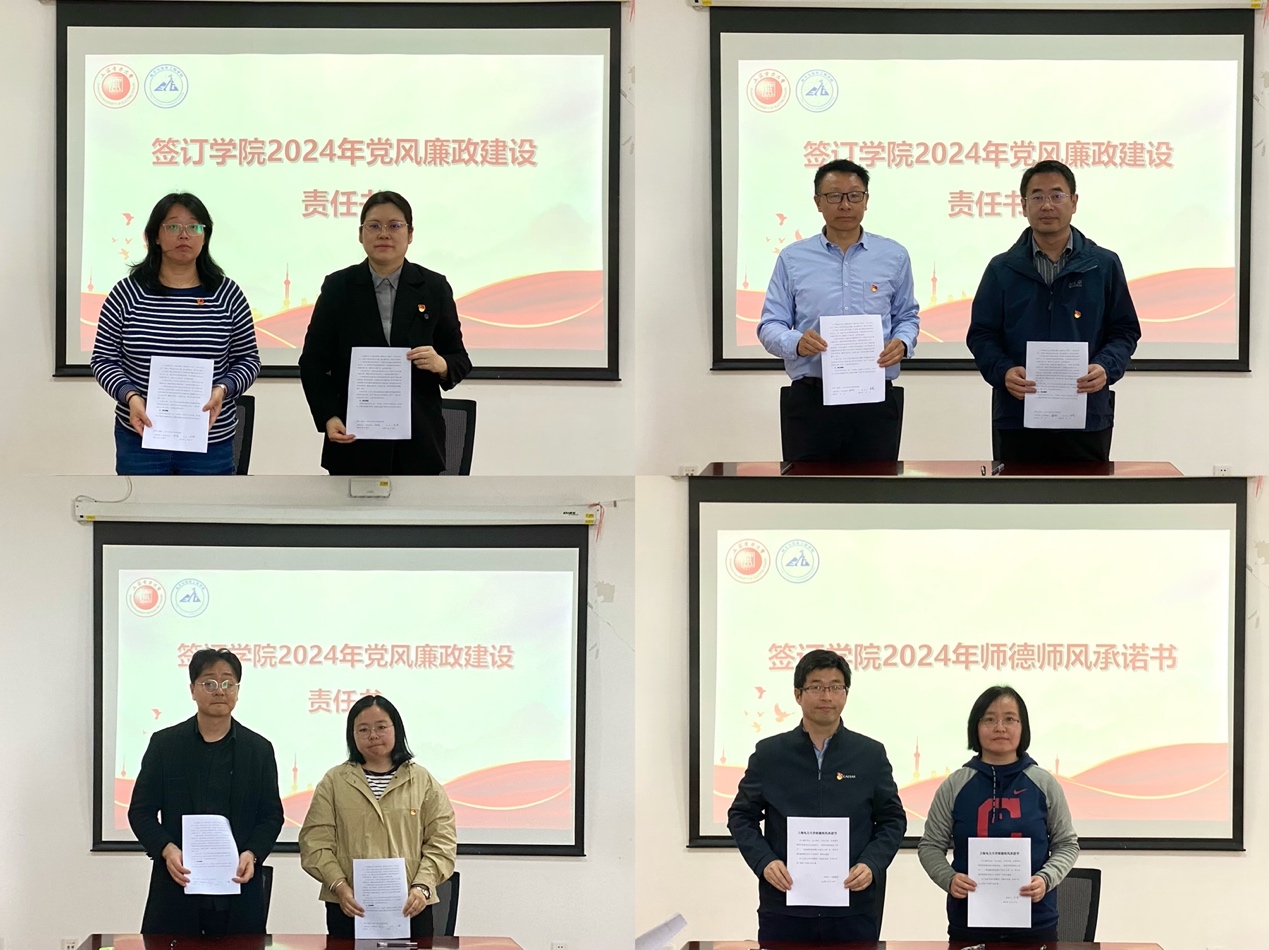 学院党政班子成员、重点岗位负责人分别签订了学院《2024年党风廉政建设责任书》,全体与会人员集体签订了学院《师德师风承诺书》,并观看了警示教育片《持续发力 纵深推进》第三集《强化正风肃纪》,教育引导党员师生自觉做到防微杜渐、对照反思,严守廉洁底线。