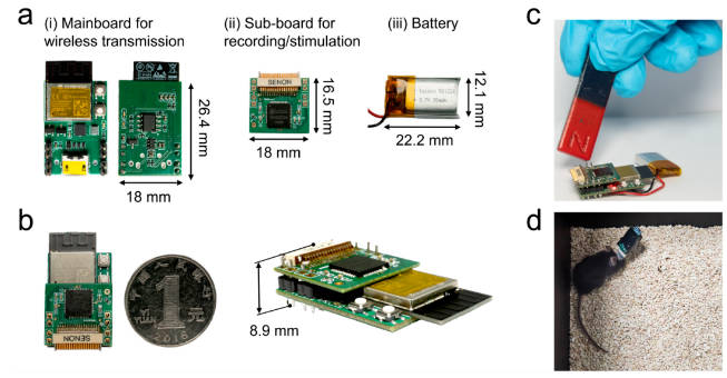 该无线脑机接口芯片系统采用堆叠式结构,模块化设计包括主板、电池模块和信号采集子板,整体重量仅为6.2克,尺寸为18mm×26.4mm×15mm。其主板使用了性能出色的ESP32C3芯片,具备双模无线通信能力,可以灵活切换低功耗蓝牙与高采样率的Wi-Fi信号传输。在信号采集方面,子板搭载的RHS2116芯片支持16通道高保真信号采集,能够最大幅值达到2.55mA的双相电流刺激,从而更好地适应多样化的神经信号采集与调控应用需求。