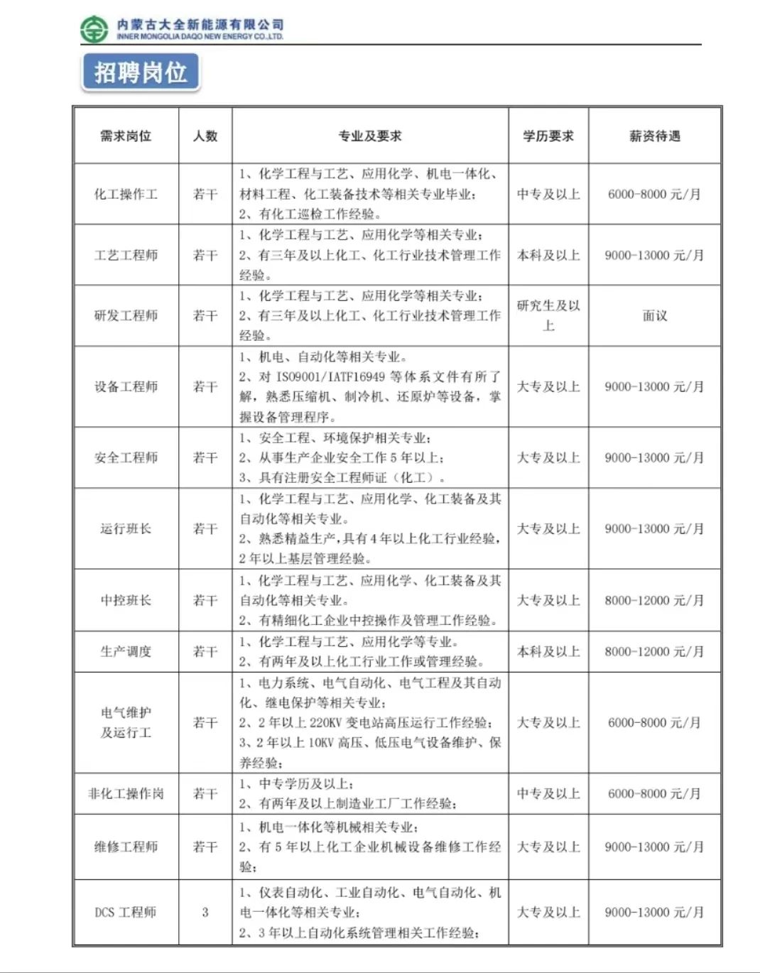 【招聘公告】内蒙古大全新能源有限公司招聘简章