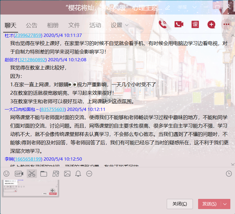 本次线上活动,各班级同学都积极响应,热烈讨论,共同研究遇到的困难,共同想办法解决遇到的问题以及因为疫情原因所带来的从未遇到的状况。在讨论中,同学们敞开心扉,不只是心理委员在帮助同学,其他同学也热心解答,热心分享。