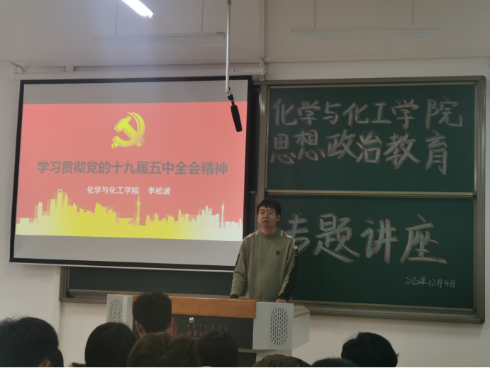 2020年12月4日,beat365官方网站在明德楼H108开展思想政治理论课专题讲座。本次讲座主题为:学习贯彻党的十九届五中全会精神,主讲人:beat365官方网站党总支书记李松波。