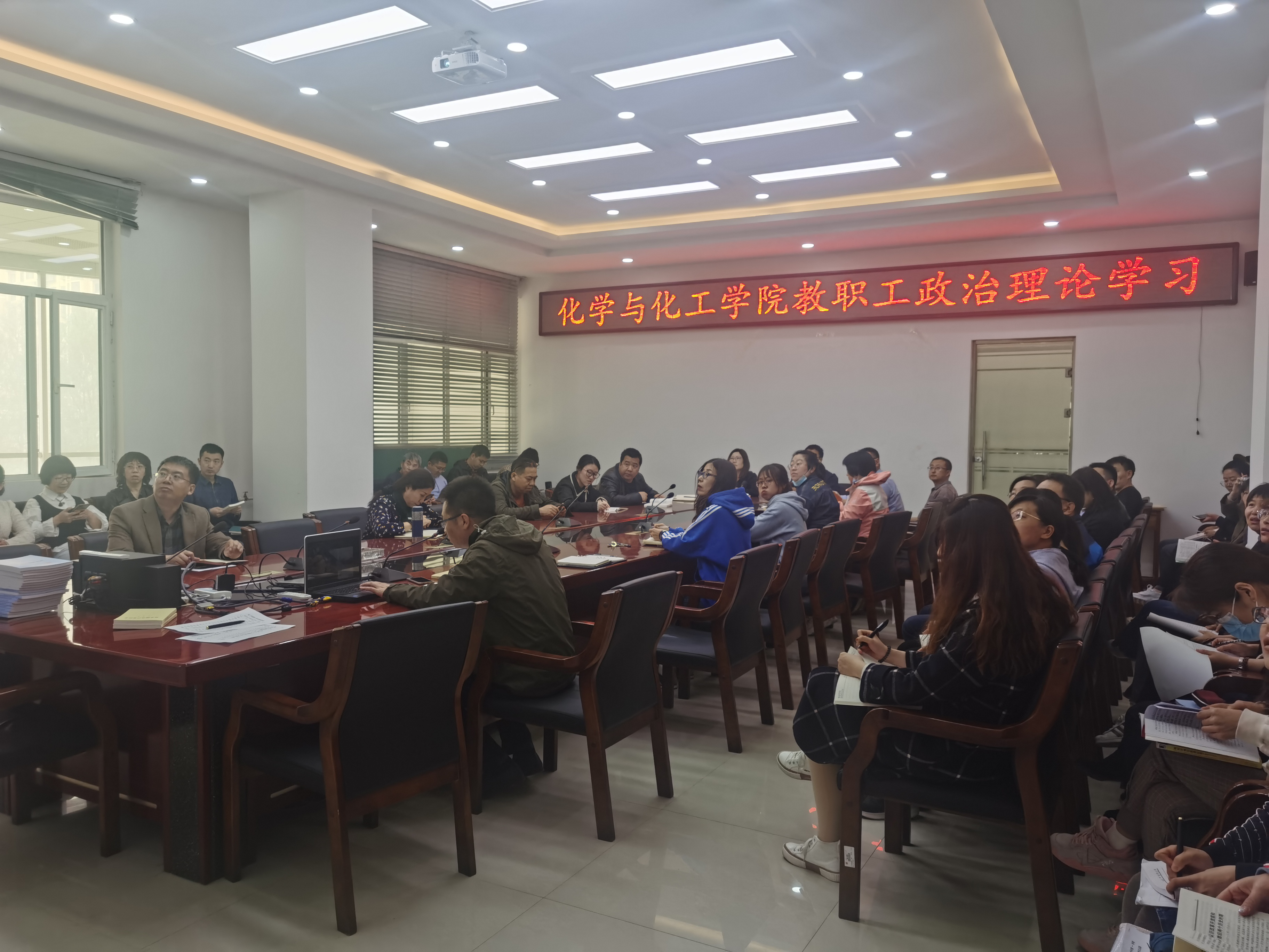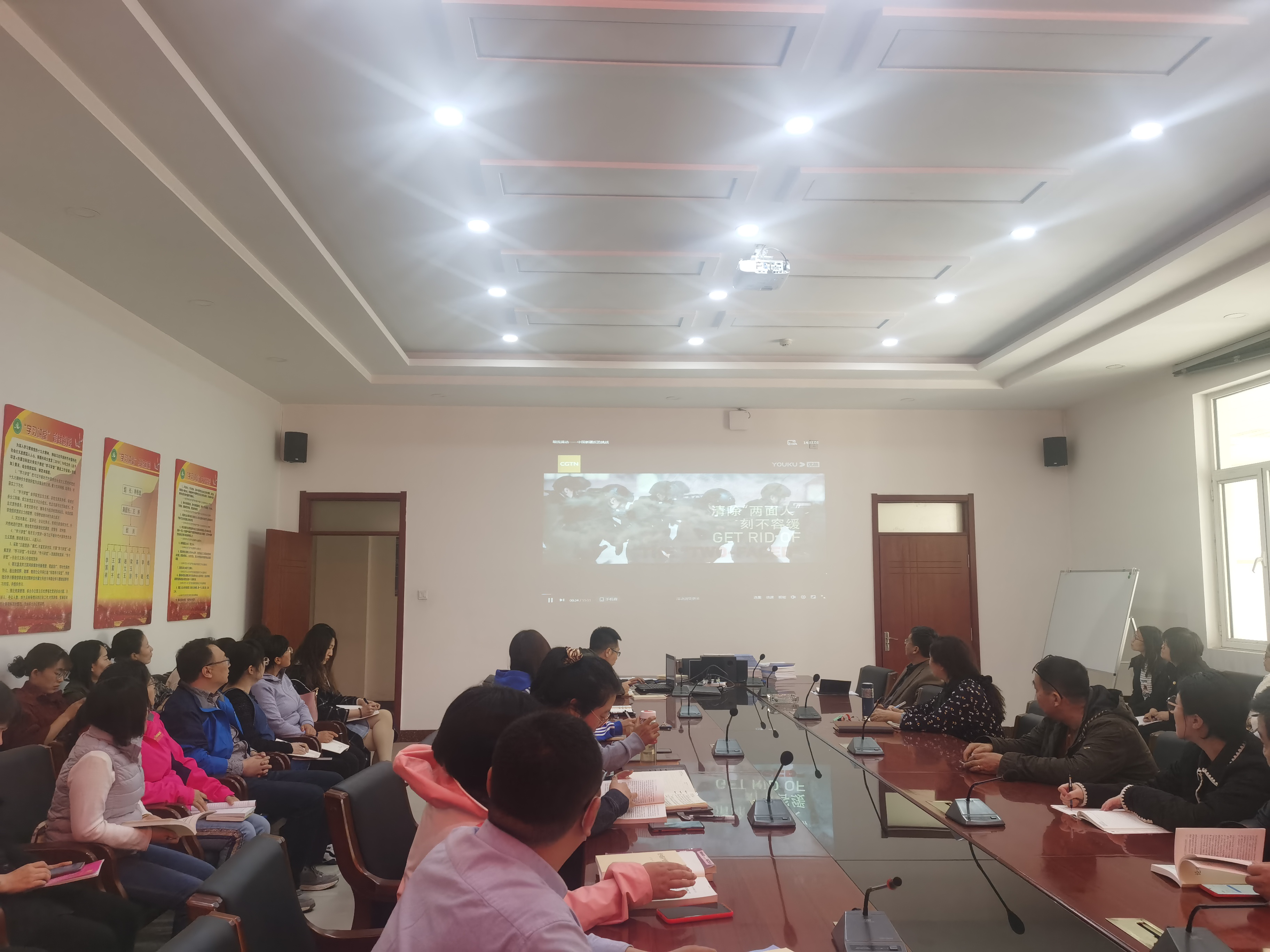 2021年4月15日下午14:30,beat365官方网站在逸夫楼E202会议室开展教职工政治理论学习。全体教职工参加学习。本次学习内容为:观看纪录片《暗流涌动-中国新疆反恐挑战》。