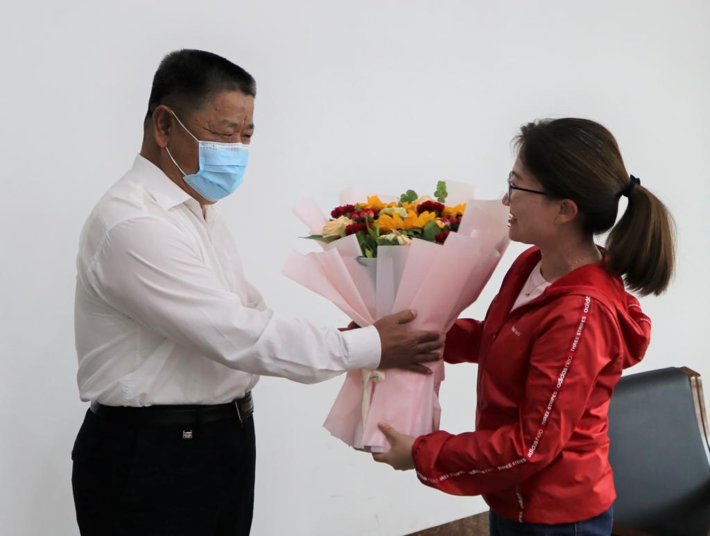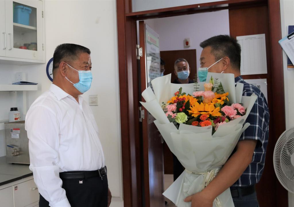 随后冯书记慰问学院辅导员、学工办主任冀虹。冯书记说:“冀虹入职十多年,一直从事辅导员工作,工作扎实认真,是辅导员队伍中的优秀代表。特别是在疫情防控期间,面临学生返校的巨大压力,全校辅导员队伍冲锋在前,日日夜夜守护在疫情防控一线,值此教师节来临之际,我代表校党委来慰问你,也是对整个辅导员队伍的辛勤付出表示感谢!”