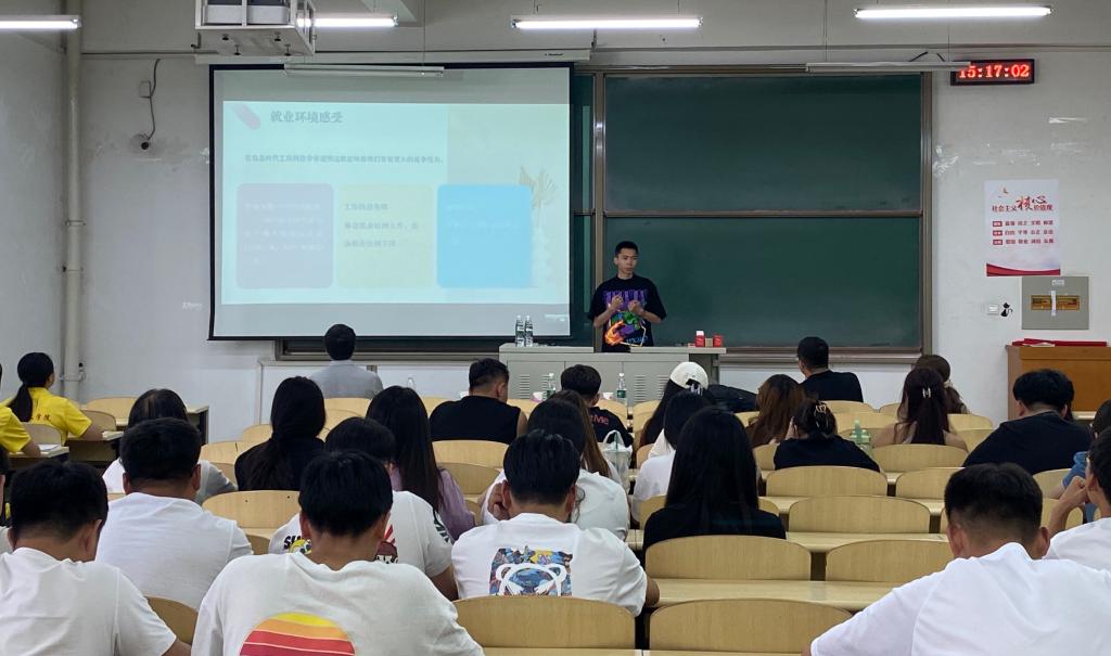 2023届毕业生代表胡荣海(目前已签约云南一家国企单位)从当前就业形势、个人就业经历心得及就业信息获取渠道等方面与大家分享就业经验,鼓励同学们做好充分准备,抢占就业先机,主动就业。