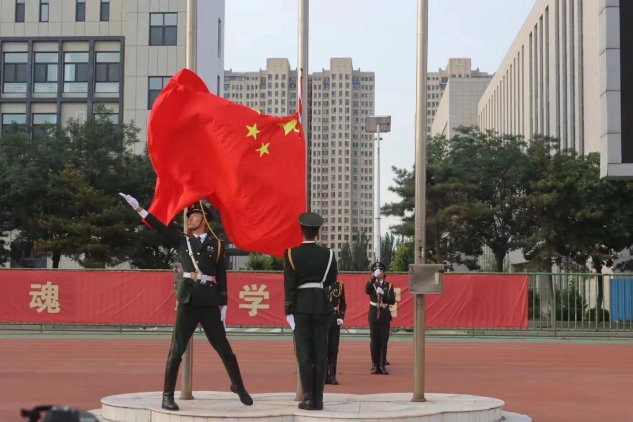 国旗护卫队的升旗手们护卫着鲜艳的五星红旗入场,伴随着《义勇军进行曲》的响起,老师和同学们集体行注目礼并共唱国歌,庄严肃穆。鲜艳的五星红旗冉冉升起,给予了每个人以温暖与力量。随后两组学生党员分别做了主题为《民族团结一家亲,同心共筑中国梦》、《草原母亲张凤仙的故事》的国旗下演讲,引导同学们牢固树立休戚与共、荣辱与共、生死与共、命运与共的共同体理念。