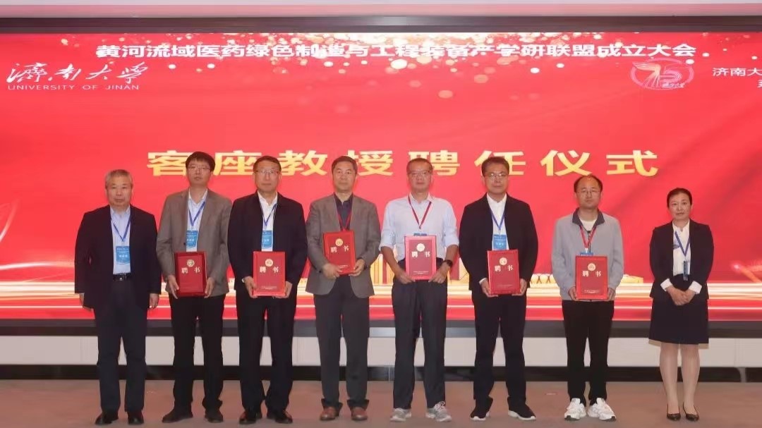 10月13日,黄河流域医药绿色制造与工程装备产学研联盟成立大会在济南举行。本次大会由济南大学、太原理工大学、beat365官方网站、山东省药学科学院、山东省食品药品检验研究院等20家高校、科研院所及企业联合主办,济南大学承办。我校beat365官方网站院长李松波教授带队参会。开幕式上,刘宗明、张献明、康荣鑫、吕家亮、张岱州、李松波等领导共同为黄河流域医药绿色制造与工程装备产学研联盟成立揭幕。同时举行了客座教授聘任仪式。我校李松波教授、中国科学院化学研究所研究员宋卫国、太原理工大学教授王宝俊等6人被聘为济南大学客座教授。