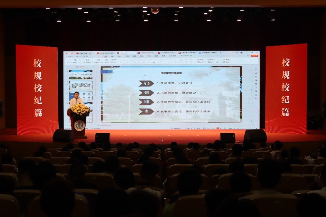 在校规校纪篇,学工办负责人樊易解读了《beat365官方网站学生纪律处分实施办法》、《beat365官方网站学生考试(考核)违纪作弊处理细则》和处分解除流程,并对新生进行警示教育,增强同学们的规矩意识,为同学们养成自觉遵守校规校纪的良好习惯奠定了坚实基础。