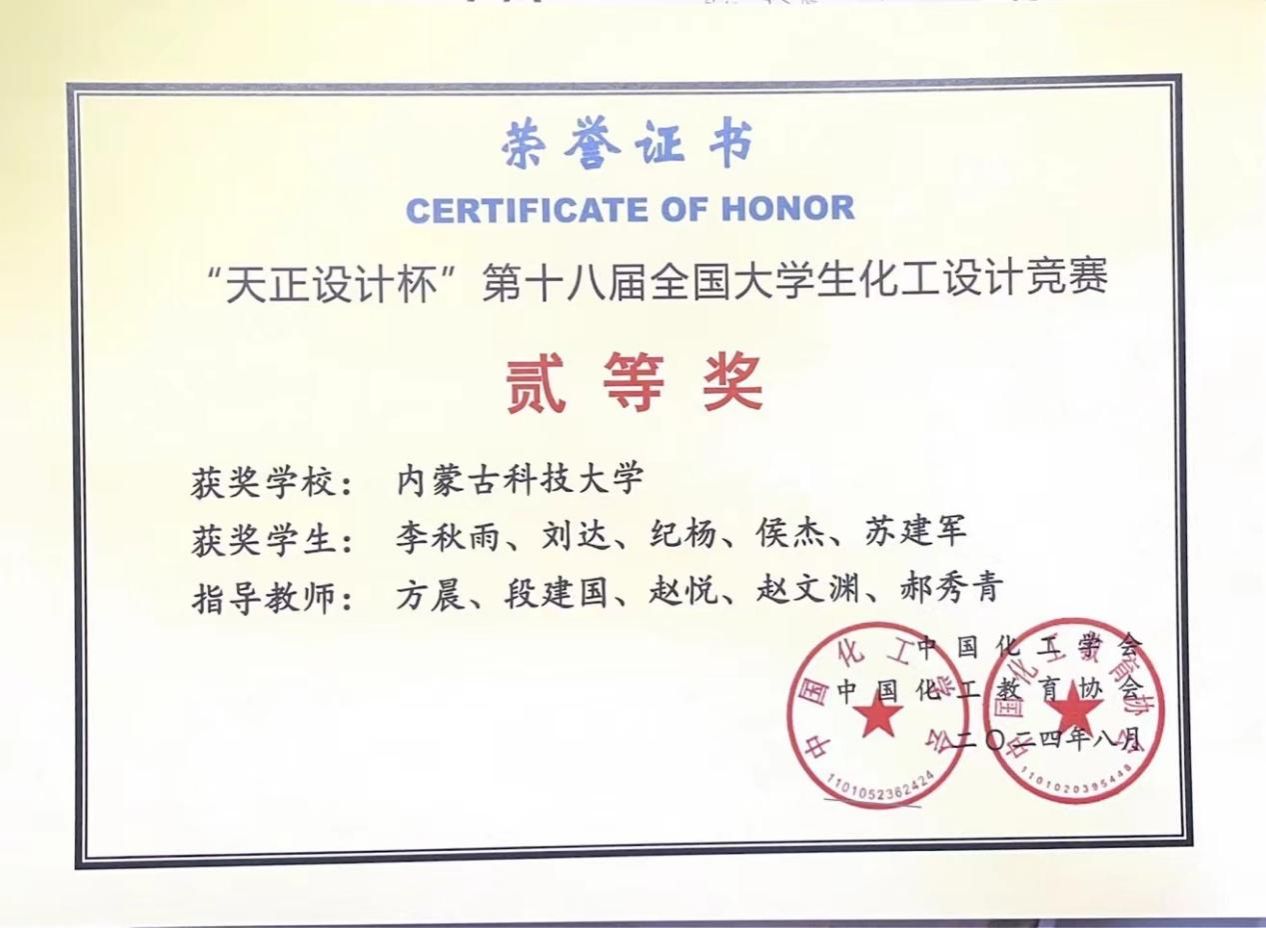 beat365官网学生李秋雨、刘达、纪杨、侯杰、苏建军组成的“活力醛开,醇享未来”团队,在方晨、段建国、赵悦、赵文渊、郝秀青老师的指导下,凭借扎实和良好的工程教育素养荣获全国大学生化工设计竞赛全国二等奖、华北赛区一等奖。