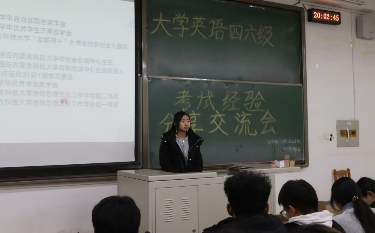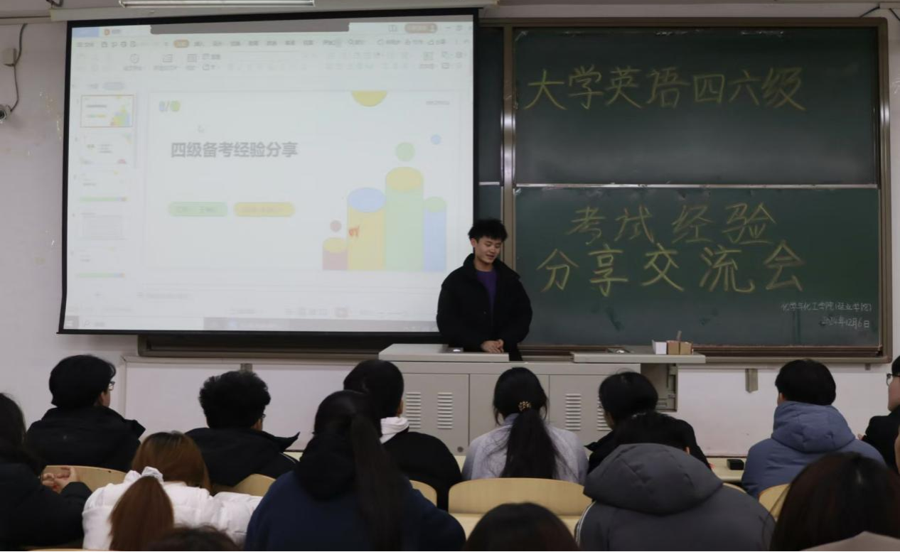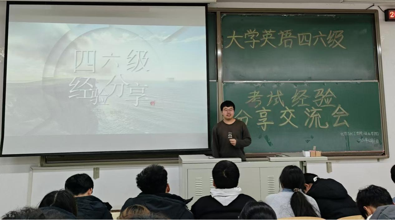 本次活动邀请化工21-4班王烨荣、轻化21-1班徐苗苗、化工22-2班王瑞弘、能化22-4班张俊珲4位同学进行分享,他们结合自身经历,从单词背诵、听力训练、阅读技巧、写作及翻译提升等方面详细分享了备考经验。过程中,他们耐心地回答了现场同学们的提问,帮助大家缓解了备考的焦虑,进一步点燃了大家的学习热情。