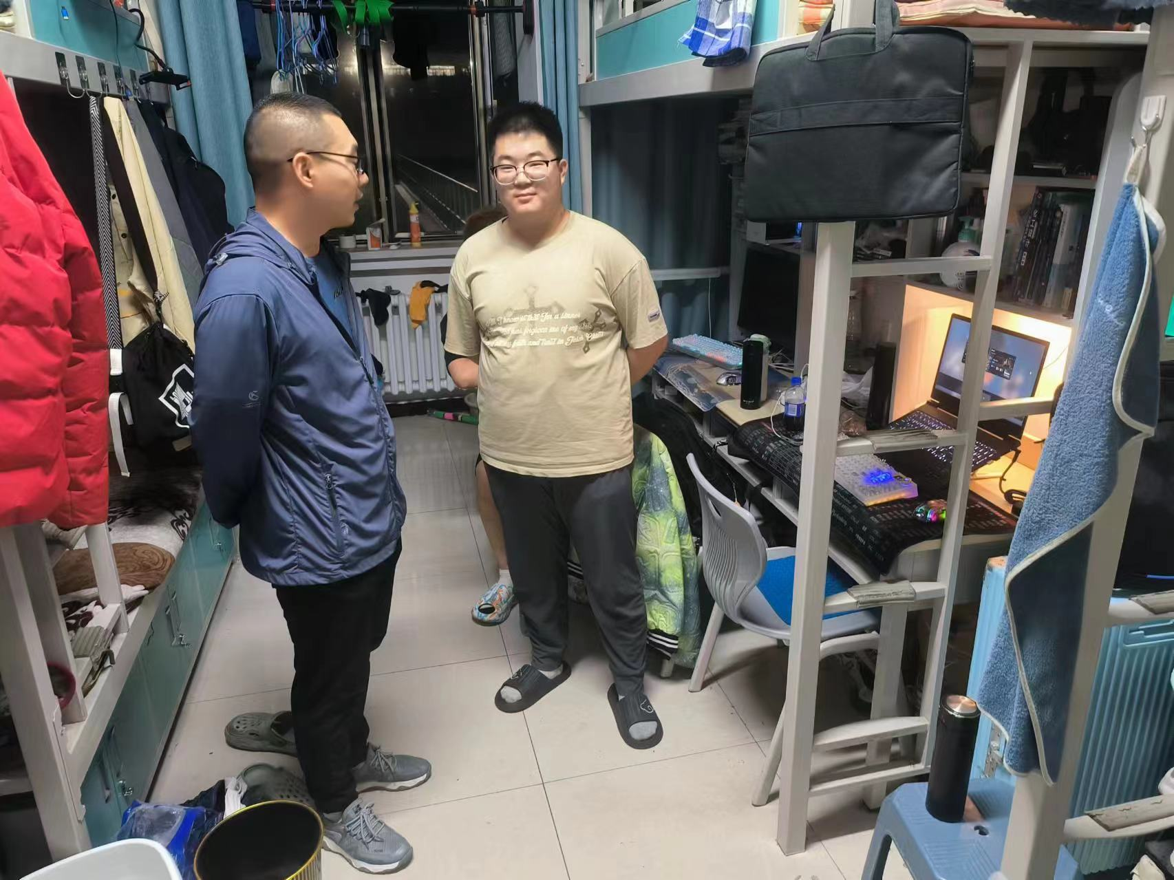 在走访宿舍过程中,冀虹书记叮嘱同学们在生活和学习中遇到任何困难,都可以及时向学院领导、班主任、辅导员老师寻求帮助,同时提醒同学们务必注意宿舍用电安全、人身安全和财产安全,提高防诈骗意识。樊易主任对同学们提出以下要求:一要加强寝室清洁管理,保持宿舍环境卫生;二要注重宿舍文化建设,共同营造和谐友爱、积极向上的良好氛围;三要做好新学期规划,定好学习目标。
