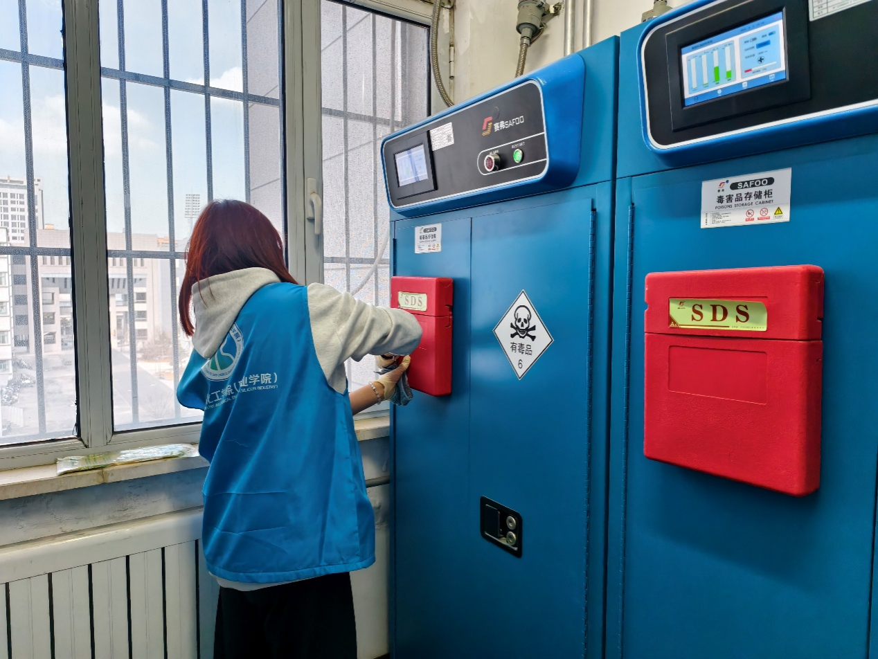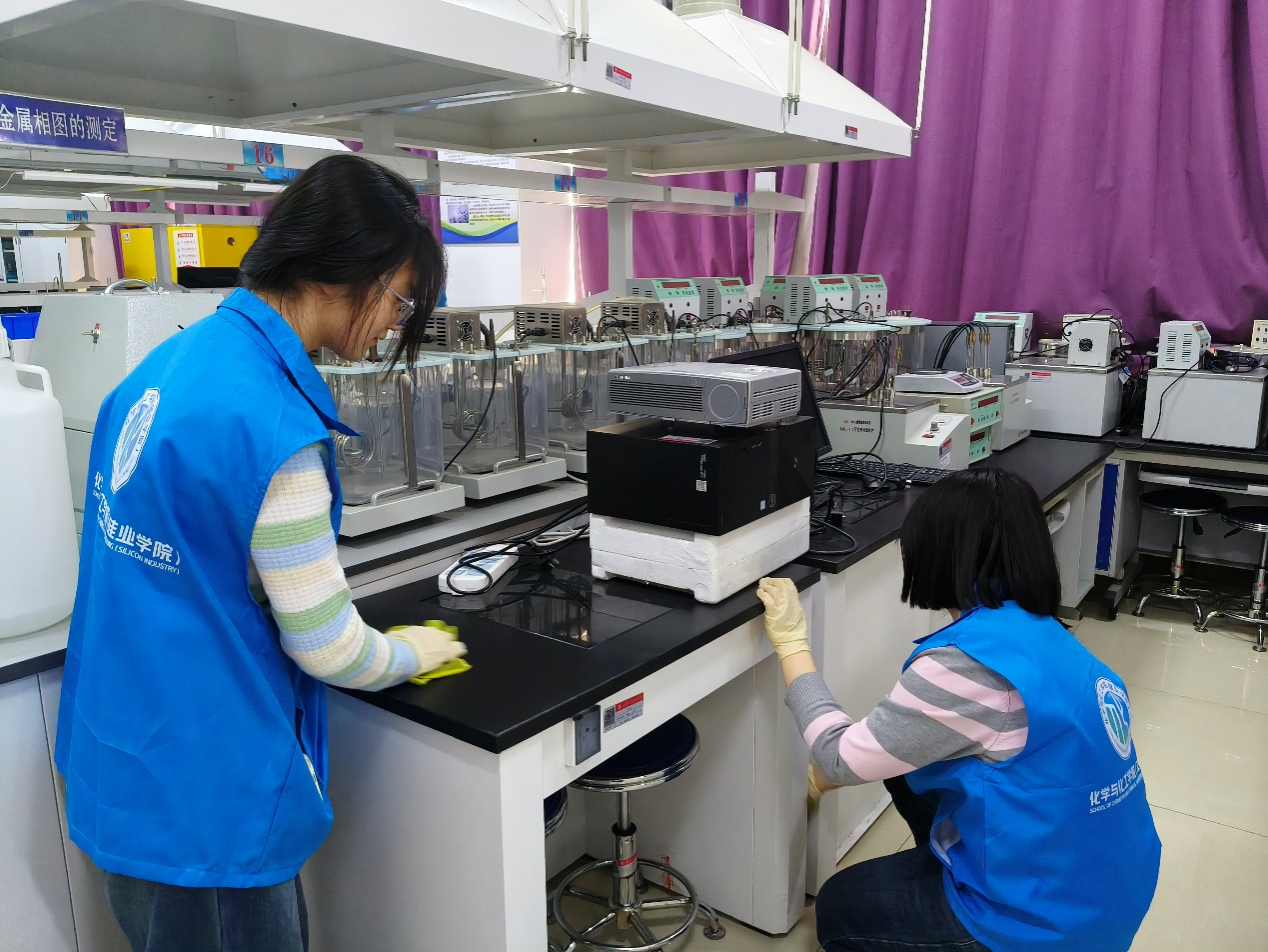 志愿者在实验室教师指导下,清洗玻璃器皿、全面擦拭实验台面油渍污垢,清洁地面顽固化学残留,并按类别和规格有序摆放试剂瓶,记录水电线路等隐患点并同步报修。