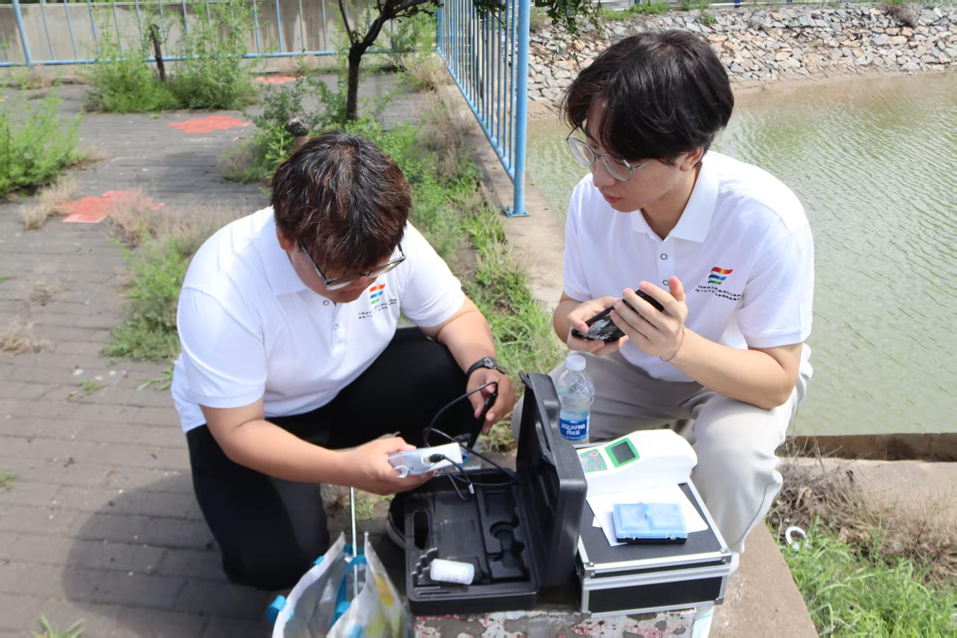 随后成员们深入低于黄河水位线3米的地下车间操作学习,详细了解了扬水站的轴流泵工作原理和中控操作规程。同时用抽取的黄河水进行抽样检测,重点检测了黄河水的浊度、色度和含氧量,这些检测结果不仅为评估黄河水灌溉适宜性提供了科学依据,为保障农产品质量安全提供有力数据。