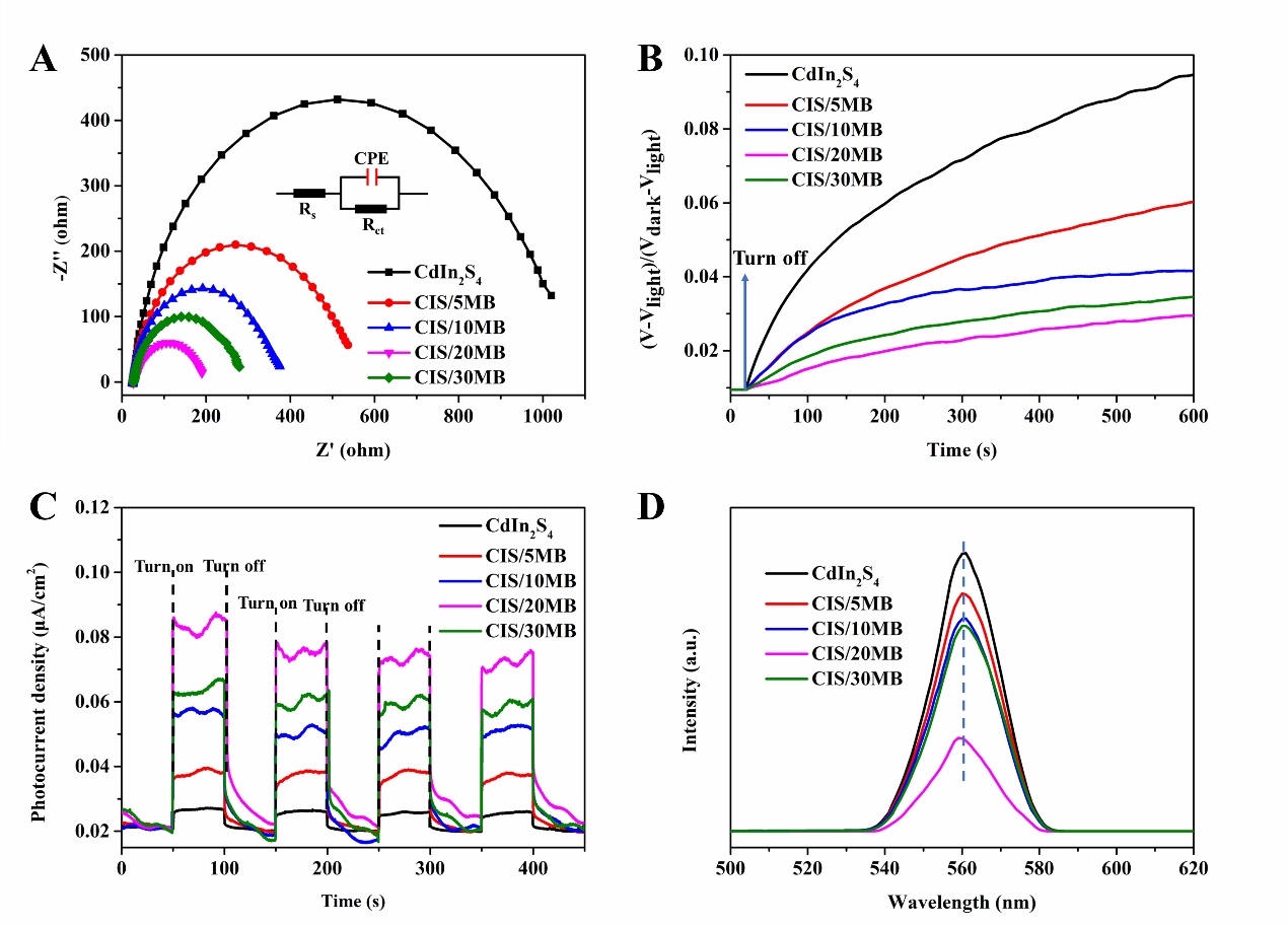 研究表明,CdIn2S4/MoB异质结光催化剂有优异而稳定的活性,最佳复合物的产氢活性高达463.53μmol⋅g-1⋅h-1,相比于CdIn2S4-1%Pt活性明显提高。在紫外光电子测试中,CdIn2S4/MoB复合材料的费米能级与CdIn2S4和MoB相比发生了一定的位移,表现为费米能级的重排和Schottky异质结的形成。形成的肖特基异质结极大地促进了电子从CdIn2S4向MoB的迁移(经XPS测试证实),从而获得了较高的电荷分离效率(被一系列电化学和光致发光结果证实)。最后,总结活性明显提高不仅是由于电荷重分配诱导形成了肖特基异质结,导致了高效的载流子分离,而且还由于MoB增加了复合材料的析氢位点,在动力学上加速了H2的释放。