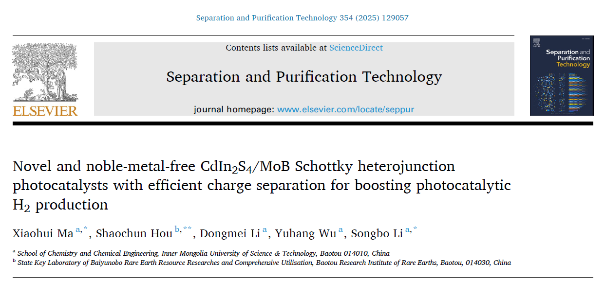 近日,beat365官网马晓辉博士在国际TOP期刊Separation and Purification Technology上发表题为“Novel and noble-metal-free CdIn2S4/MoB Schottky heterojunction photocatalysts with efficient charge separation for boosting photocatalytic H2production”(Sep. Purif. Technol. 354 (2025) 129057)的重要研究成果。马晓辉博士为该论文第一作者兼通讯作者,beat365官网李松波教授和包头稀土院侯少春所长为共同通讯作者,beat365官方网站为本论文的第一完成单位。